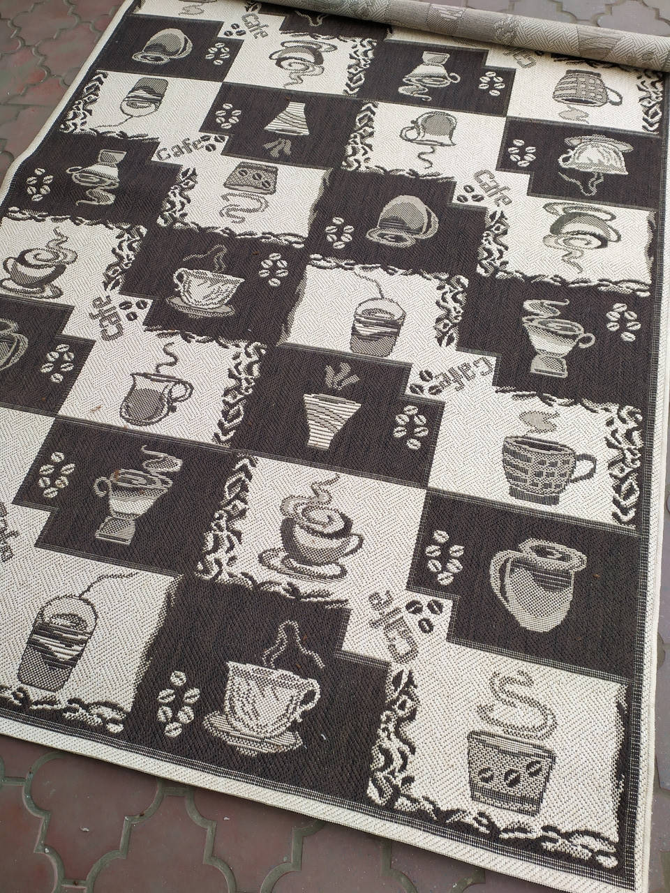 Фабричний Безворсовий килим Natura з кухонним дизайном! Найпрактичніша якість! В складі килиму 50% натуральний льон! Кольори: Темно-коричневі та молочні! Основа: ткана(джутова нитка)! Коврик можна легко пропилососити, змести, почистити від любих видів плям в домашніх умовах, мийках або у спеціалізованих хімчистках!