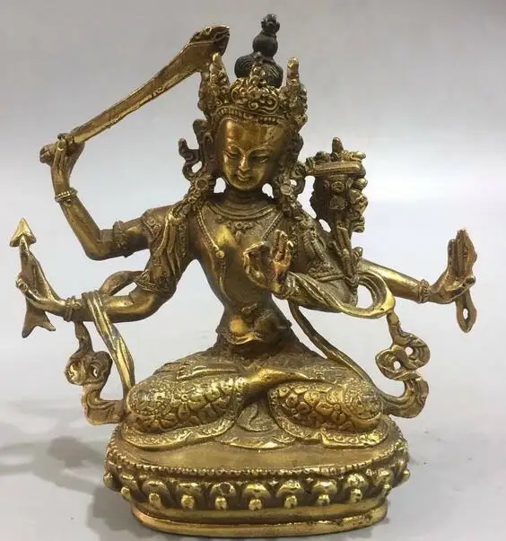 Китайская античная тибетская буддистская старинная медная рукоятка Manjusri статуя Гуаньинь Будды
