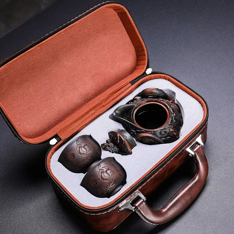 Китайская фиолетовая керамика ручной работы с резьбой по ворсу, летающий дракон, ручная захват, горшок для путешествий, чайный сервиз, горшок, две чашки, чайный сервиз кунг-фу
