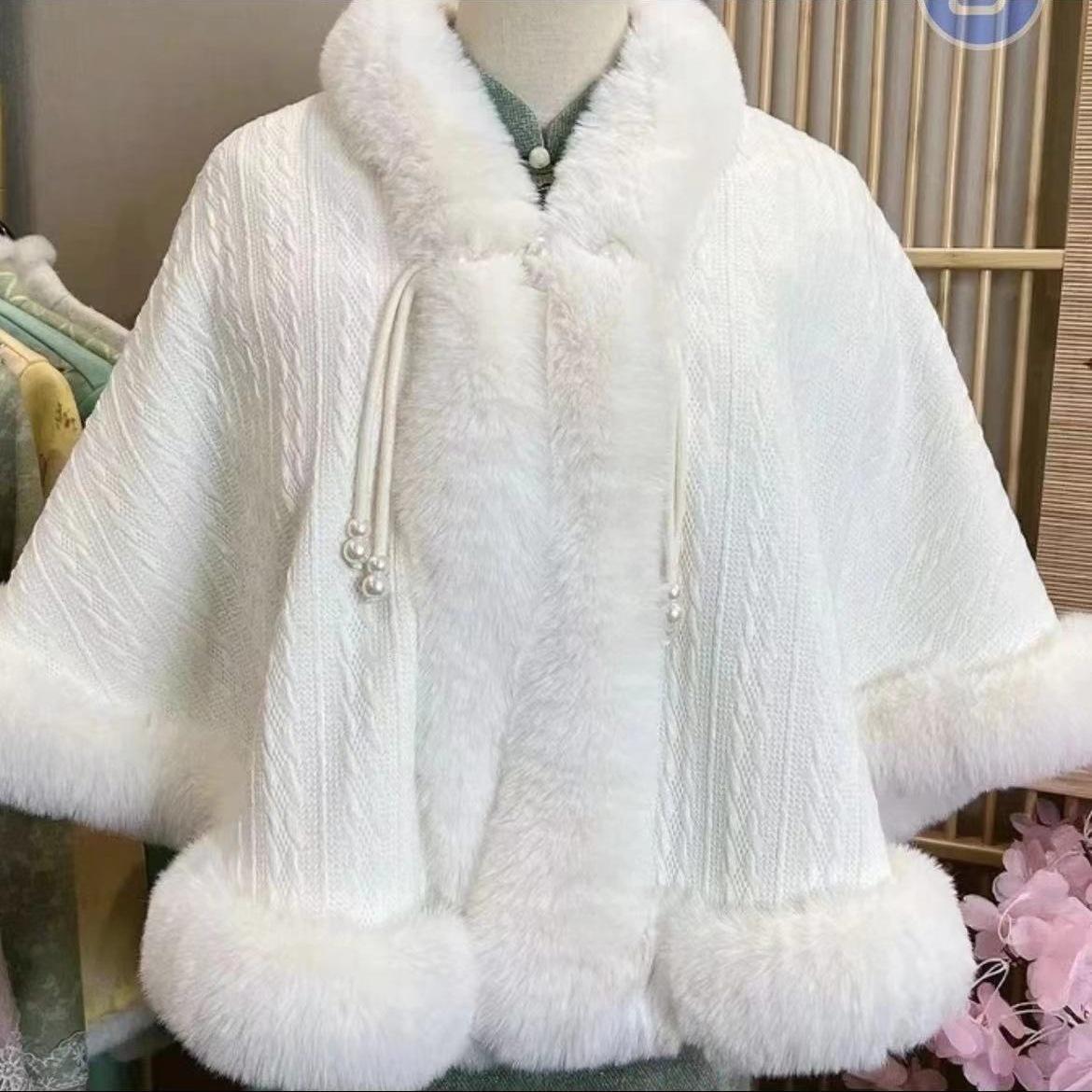 Китайский стиль Чонсам Ханфу внешняя шаль с начесом утолщенный меховой воротник вязаное маленькое пальто теплая накидка 120CM белый