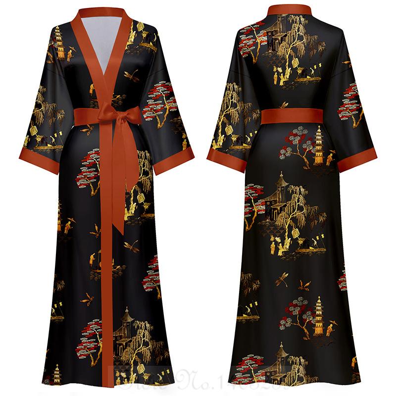 Китайский стиль печати женский длинный халат ночная рубашка ретро атласная пижама ночная рубашка кимоно с коротким рукавом халат свободная домашняя одежда One size
