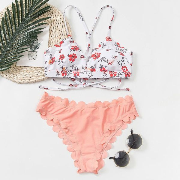 women floral bikini set scallop trim tie back swimsuit two pieces beach bathing suits swimwear lace up biquinis bathing suits1, White;black