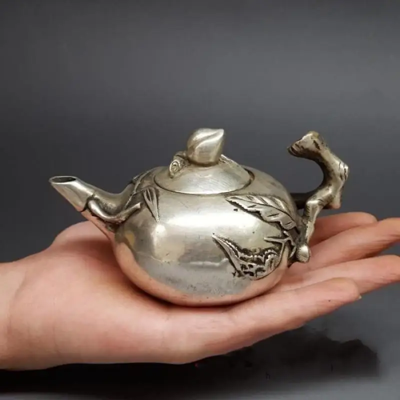 Китай, Cupronickel, серебряная резьба, бамбуковый лист, персик, иммертация, чайник, чайник, белая медь, искусственные украшения