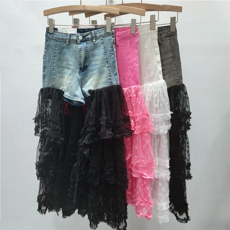 Denim Lace Trim Skirt, American Style Niche Design, New Loose High Waist Versatile A-Line Skirt