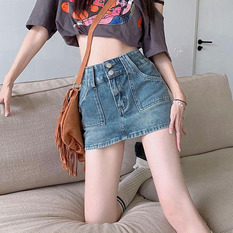Классическая универсальная молодежная юбка с двумя пуговицами, шикарная юбка-трапеция с высокой талией в стиле ретро, облегающая юбка-полуоблегающая юбка, женская летняя модная джинсовая юбка L синий