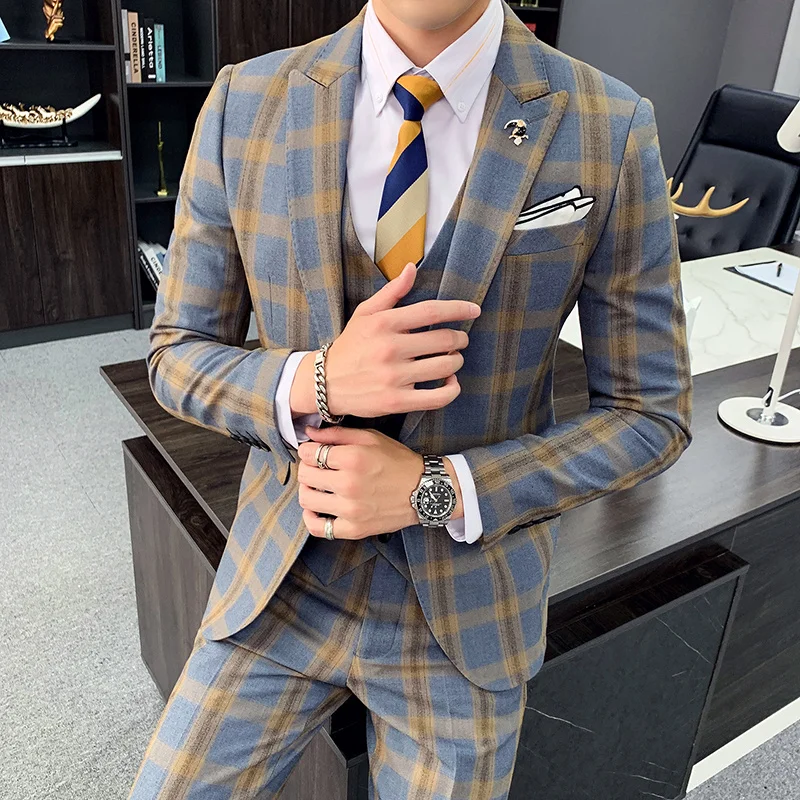 Классические мужские свадебные костюмы 2021 (пиджак + жилет + брюки) осенние серые хаки клетчатые костюмы Мужские приталенные деловые костюмы