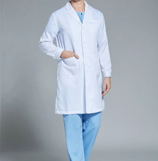 Медицинский мужской халат с длинным рукавом, функциональными накладными карманами и отложным воротником.