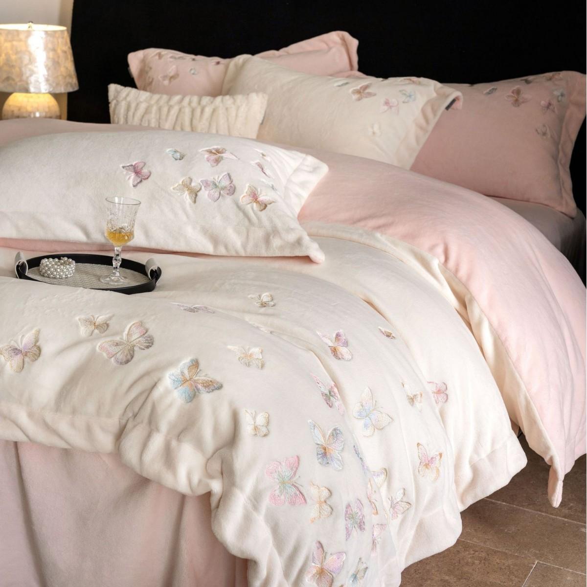 Класс А Зимняя Девочка Сердце Утолщенный Молочный Флис 4шт Комплект Вышивка Бабочки Теплая Коралловый Флис Простыня Пододеяльник Постельное Белье 1.5m bed sheet 4pc 2*2.3mquilt core