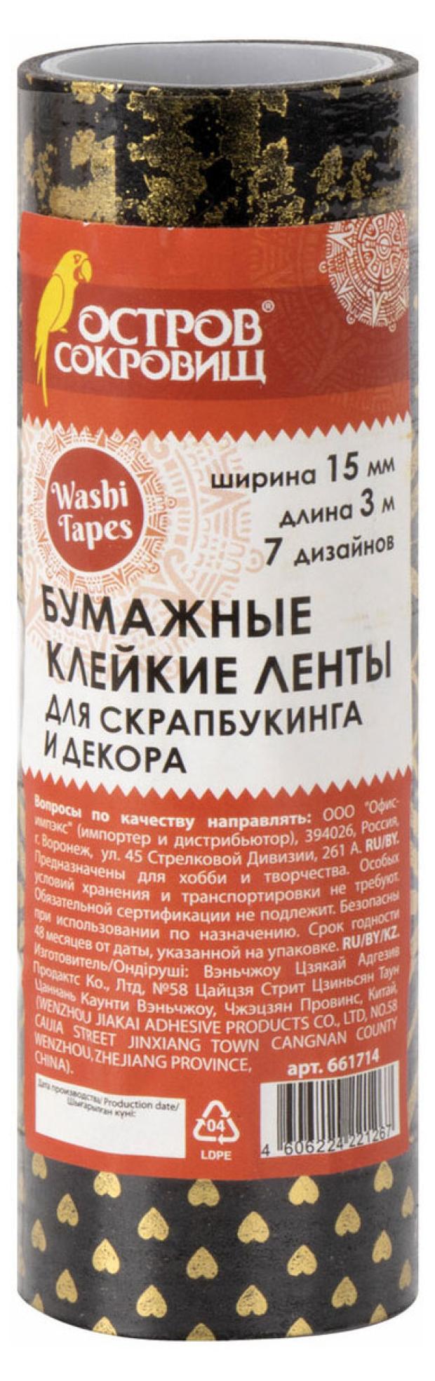 Бумажные клейкие ленты ОСТРОВ СОКРОВИЩ подходят для использования в скрапбукинге, декорирования поделок, открыток, оформления подарков. Декоративные ленты легко приклеиваются и надежно фиксируются на любой поверхности, придавая изделиям оригинальный вид. В наборе содержится 7 бумажных лент черного цвета с различными рисунками из золотистой фольги, каждая из которых намотана на пластиковую втулку. Ширина ленты 15 мм позволяет наклеить её даже на небольшие поделки, а длина 3 м даёт большой простор для творчества. Необходимое количество ленты можно легко оторвать рукой или отрезать ножницами, самоклеящаяся основа упрощает фиксацию лент на любых поверхностях. Товар относится к среднему ценовому сегменту. Бумажные клейкие ленты с фольгированием - это изящный вариант декора фотоальбомов, различных изделий, подарочной упаковки и даже предметов интерьера. Ленты ОСТРОВ СОКРОВИЩ - блестящее украшение по доступной цене!