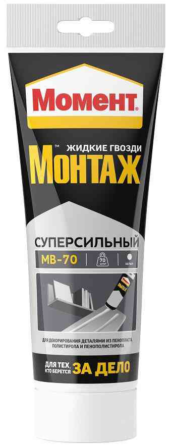 Момент Монтаж Суперсильный МВ-70 - монтажный клей с повышенной прочностью крепления.- Первоначальная сила склеивания - 70 кг/м².- Открытое время 15 минут.- Экологически чистый, без запаха. - Возможность окрашивания.Склеивает такие материалы как дерево, металл, ПВХ, керамику, ДСП, МДФ, гипсокартон, пробку, полистирол, пенопласт, гипс и другие подобные материалы. Используется для приклеивания:- Стеновых панелей из дерева, ПВХ, пробки, гипсокартон.- Изоляционных панелей, декоративных деталей, профилей.- Установка подоконников и дверных рам.- Приклеивания плинтусов и декоративных фризов.