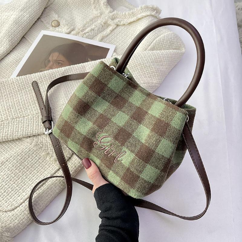 Клетчатая контрастная ретро-сумка через плечо корейская модная мини-сумка простая женская новая осенне-зимняя высококачественная фактурная сумка-ведро Mini(Max Length<20cm)