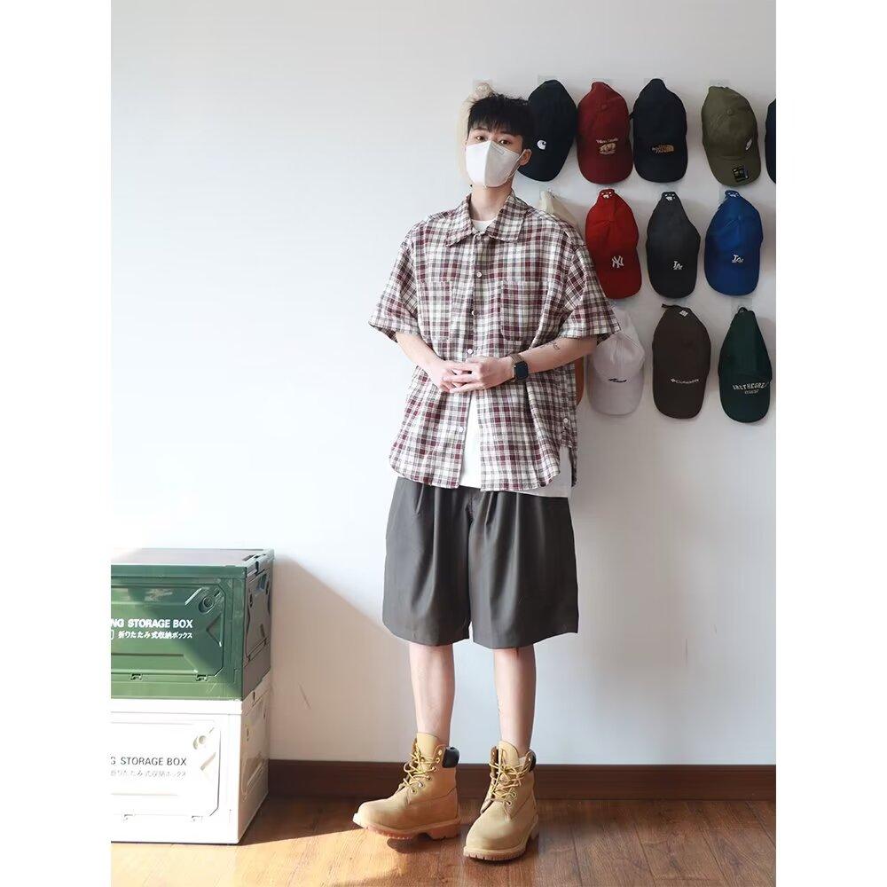 Клетчатая рубашка мужская летняя японская ретро свободная повседневная рубашка с рукавами пять четвертей американская уличная модная брендовая куртка 2XL красный
