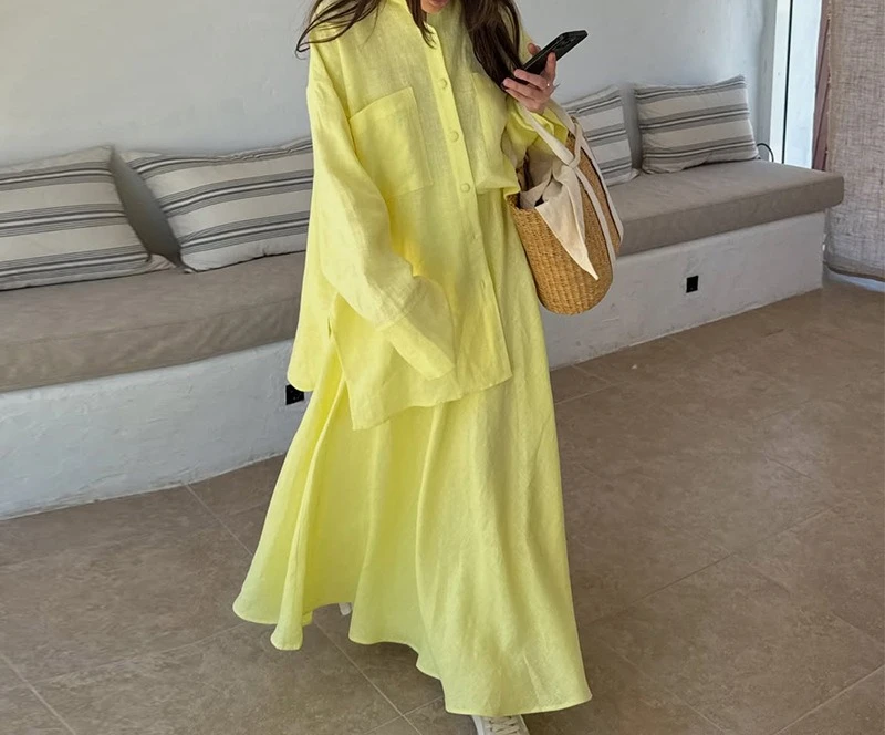 Женская одежда, новинка лета 2025 года, повседневная свободная рубашка с длинными рукавами, полуюбка, желтый модный комплект