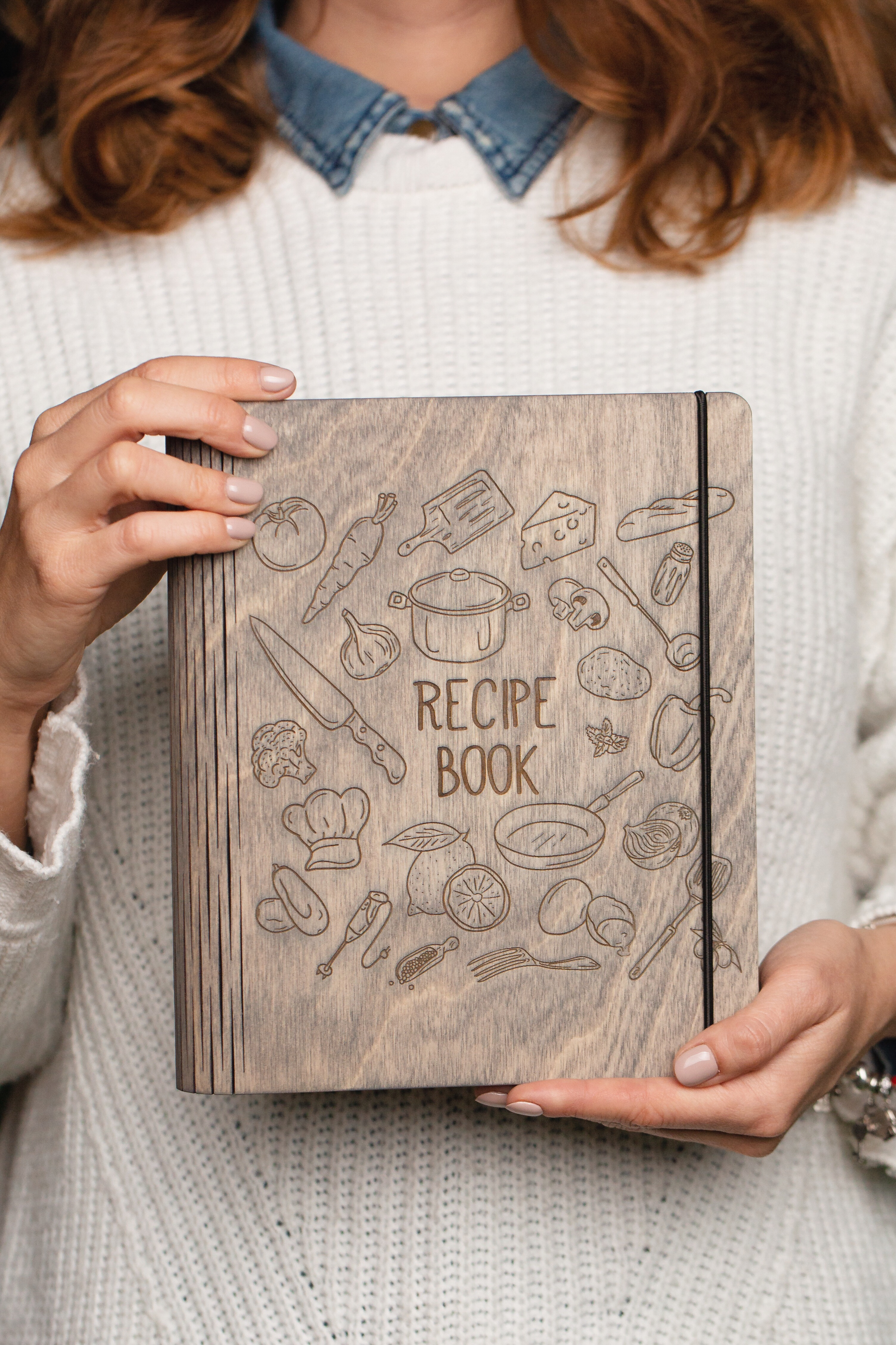 Книга для рецептов поваренная книга на подарок в деревянной цельной обложке "Recipe Book" А4 150 листов белая бумага с бланком для рецептов на одной стороне и линией на другом Серый 4