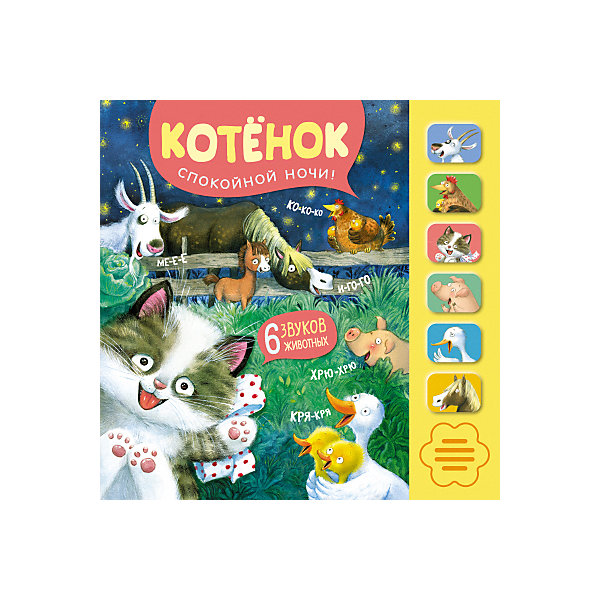 На каждом развороте можно найти стихотворение. Котенок желает спокойной ночи своим друзьям. Каждая из 6 кнопок отвечает за звук, издаваемый домашними животными.
