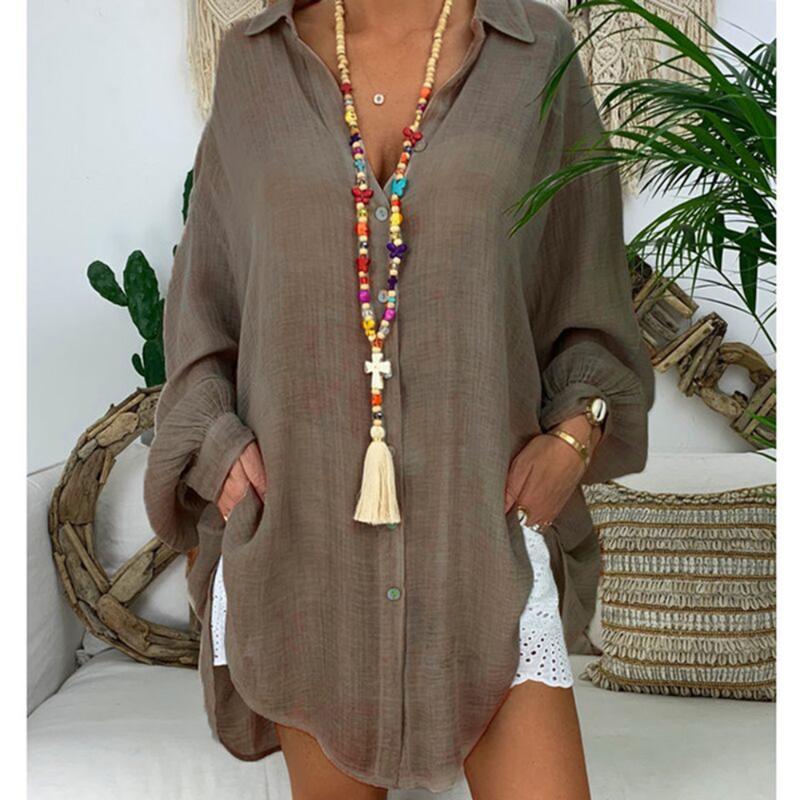 5XL Plus Size Tops Cotton Linen Shirt Women Long Sleeve White Tunic Cardigan Casual Loose Button Turn Down Collar Blouses Shirts, Blue 2