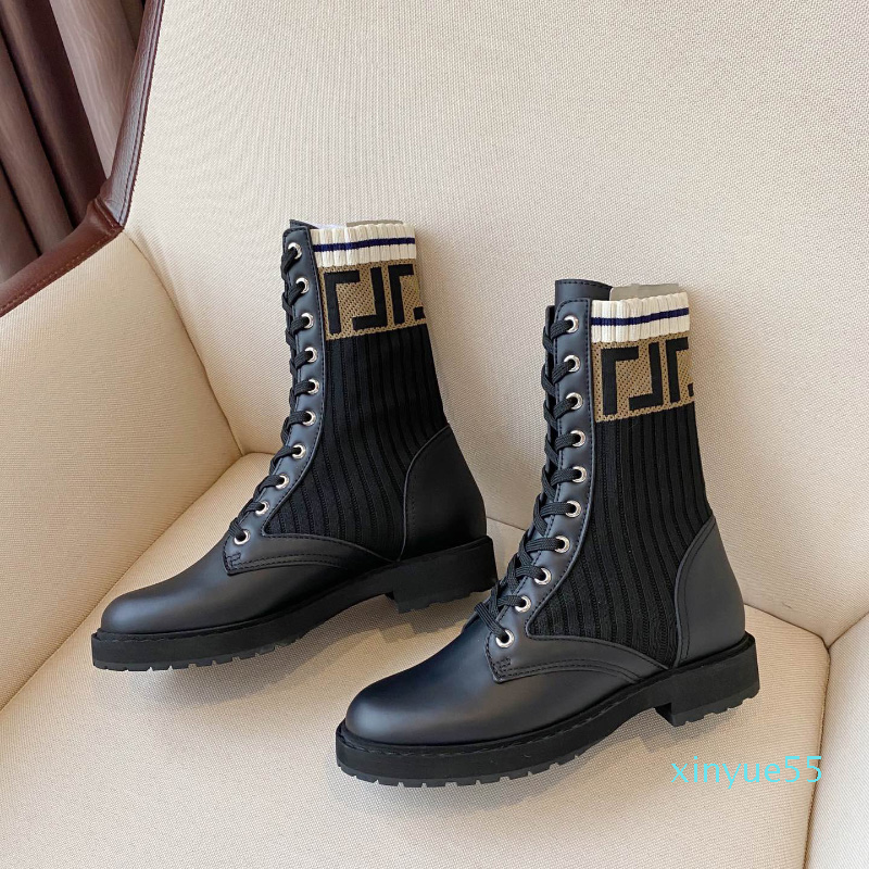 Brown FF cuff knitted sock-like flats Ankle biker boots Rockoko stretch-knit and leather combat Booties for women luxury designer shoes