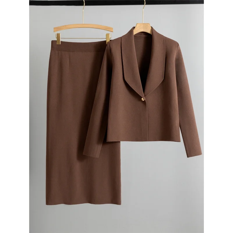 Elegant Chic Knitted 2 Piece Sets Women Lapel Neck Long Sleeve Knitwears Cardigan Tops Conjuntos Solid High Waist Skirts Outfit