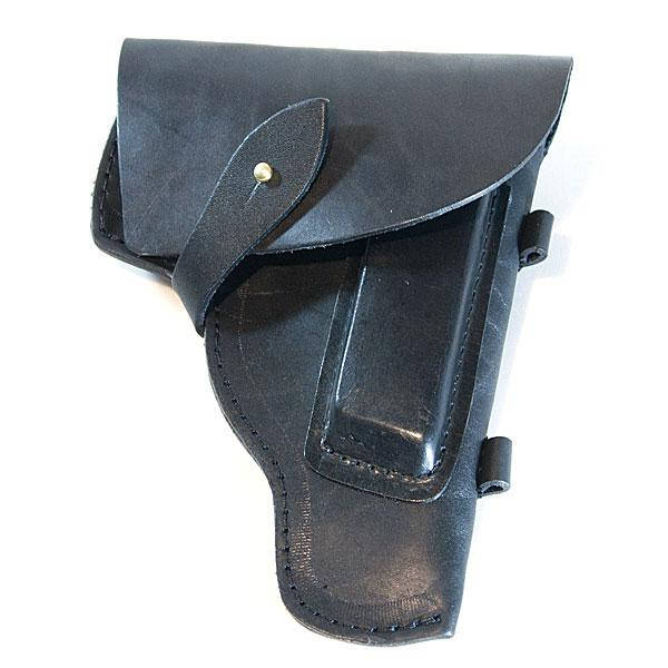 Кобура изготовлена из плотной высококачественной кожи толщиной 2,5-3,0 мм. Имеет клапан и перегородку в торце рукояти, для защиты пистолета от внешних воздействий. Внутри кобуры зафиксирован ремешок для более удобного извлечения пистолета. На задней стороне кобуры нашита кожаная накладка для ношения на поясном ремне. Максимальная ширина ремня - 50 мм. На лицевой части кобуры нашиты: формованный чехол под запасной магазин и петли для фиксации шомпола. Хлястик застёгивается на металлическую пуклю.