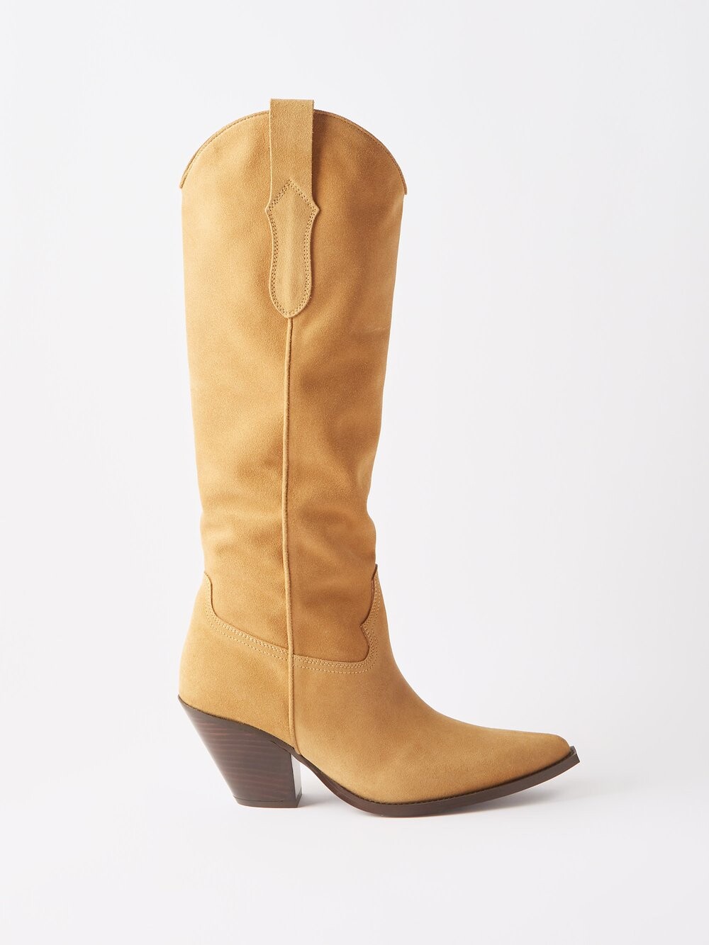 Окунитесь в богемный дух Торала с помощью этих светло-коричневых ковбойских сапог River, тщательно изготовленных в Испании из матовой замши и небольшого каблука.