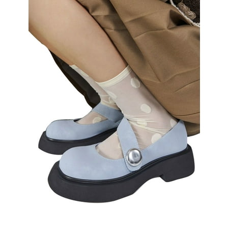 Woobling Womens Casual Round Toe Mary Jane Party Fashion Ankle Strap Leather Shoes Work Magic Tape Chunky Flats