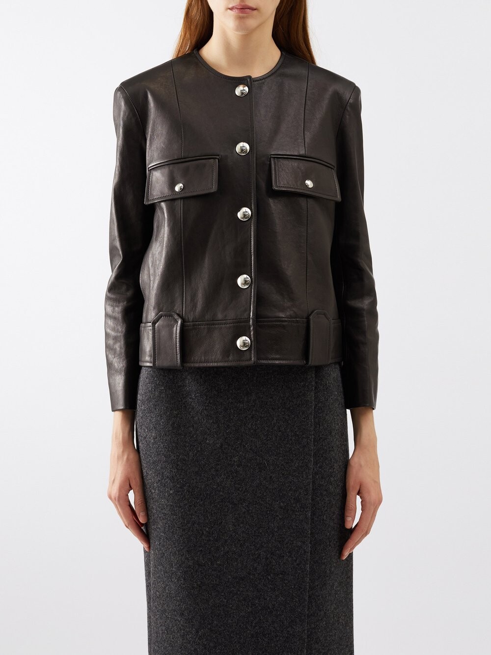 Эта черная куртка Laybin, дебютировавшая в составе полностью кожаного ансамбля на подиуме Khaite AW23, имеет форму без воротника и карманы с клапанами.