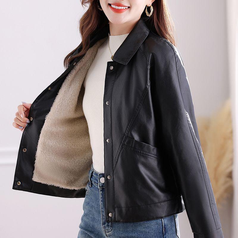 Кожаная куртка, женская короткая модель, весенне-осенняя женская куртка из ПУ кожи с лацканами и бархатом M чёрный
