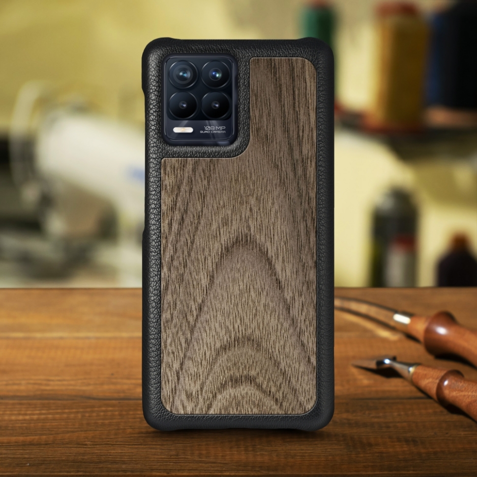 Кожаная накладка Stenk WoodBacker для Realme 8 Pro Чёрная