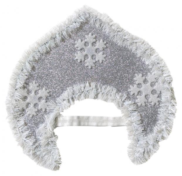 Карнавальный кокошник, украшенный декором в виде снежинок и мишурой.