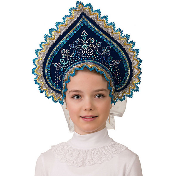 Кокошник для детского праздника дополнит образ. Украшен узором из пайеток и красивой тесьмой. Пластиковый корпус держит форму, сверху обтянут тканью.