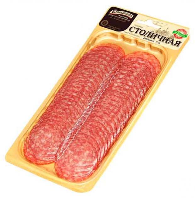 Данное наименование имеет высшую мясную категорию и давно стало классикой раздела и лидером по популярности у отечественных покупателей. Сырокопченая "Столичная" выпускается в соответствии с ГОСТ. Говядина, свинина и шпик приправлены коньяком, который придает классическому вкусовому сочетанию особенную нотку. Колбаса имеет плотную структуру и контрастный срез из мелкой мозаики.