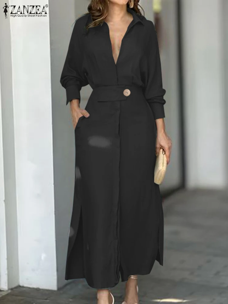 Коллекция 2023 года, Стильное женское длинное платье ZANZEA, рубашка с отложным воротником и длинным рукавом, элегантное однотонное платье, женское повседневное праздничное платье