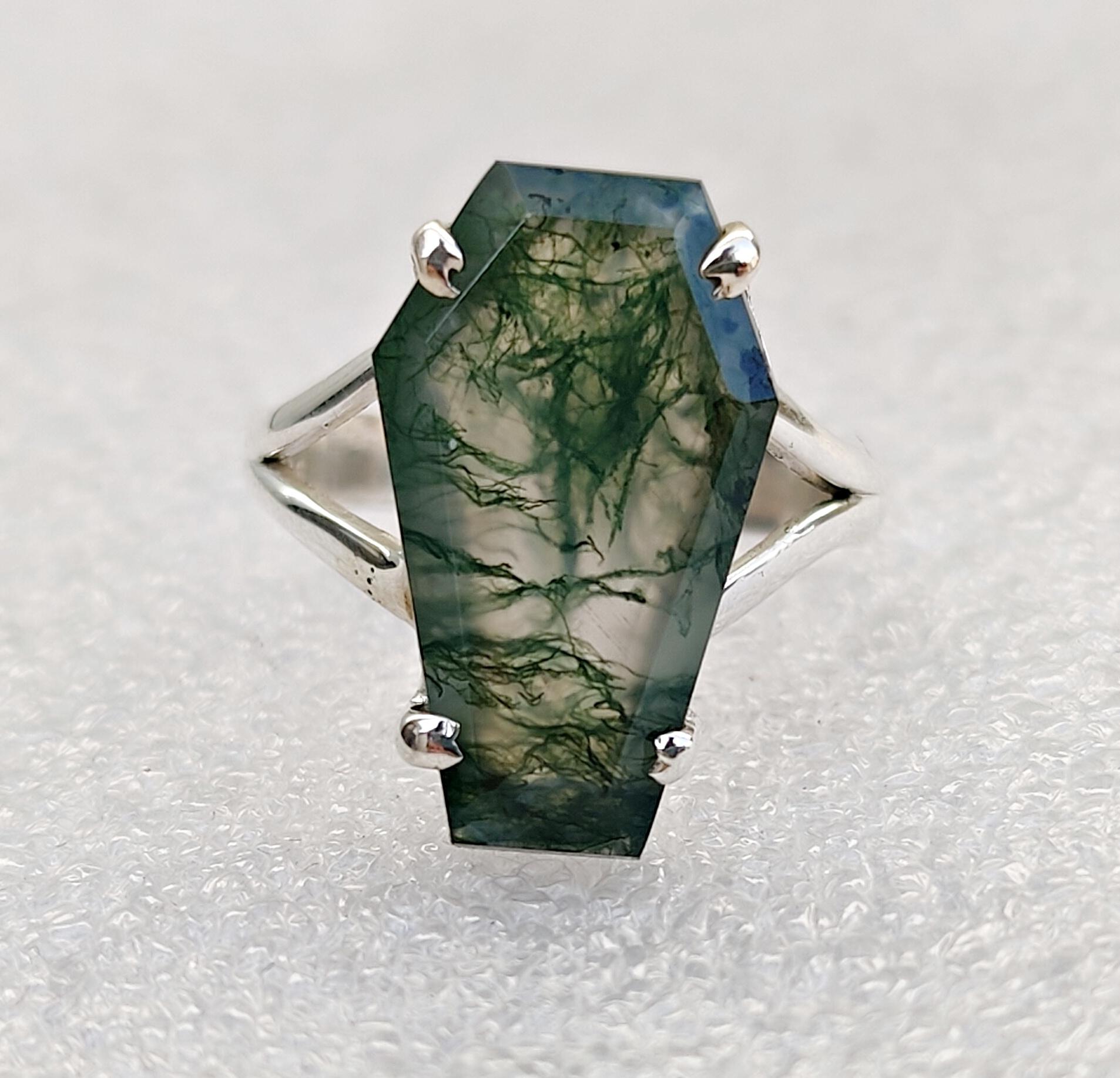 Кольцо в гробу, кольцо с моховым агатом, кольцо из стерлингового серебра 925 пробы, кольцо в стиле бохо, ювелирные изделия ручной работы, кольцо с драгоценным камнем в виде гроба с моховым агатом, подарок для нее 13