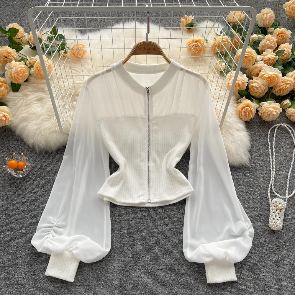 Женская шифоновая блузка составного кроя, черно-белая Элегантная короткая рубашка с V-образным вырезом, длинным рукавом-фонариком и молнией...