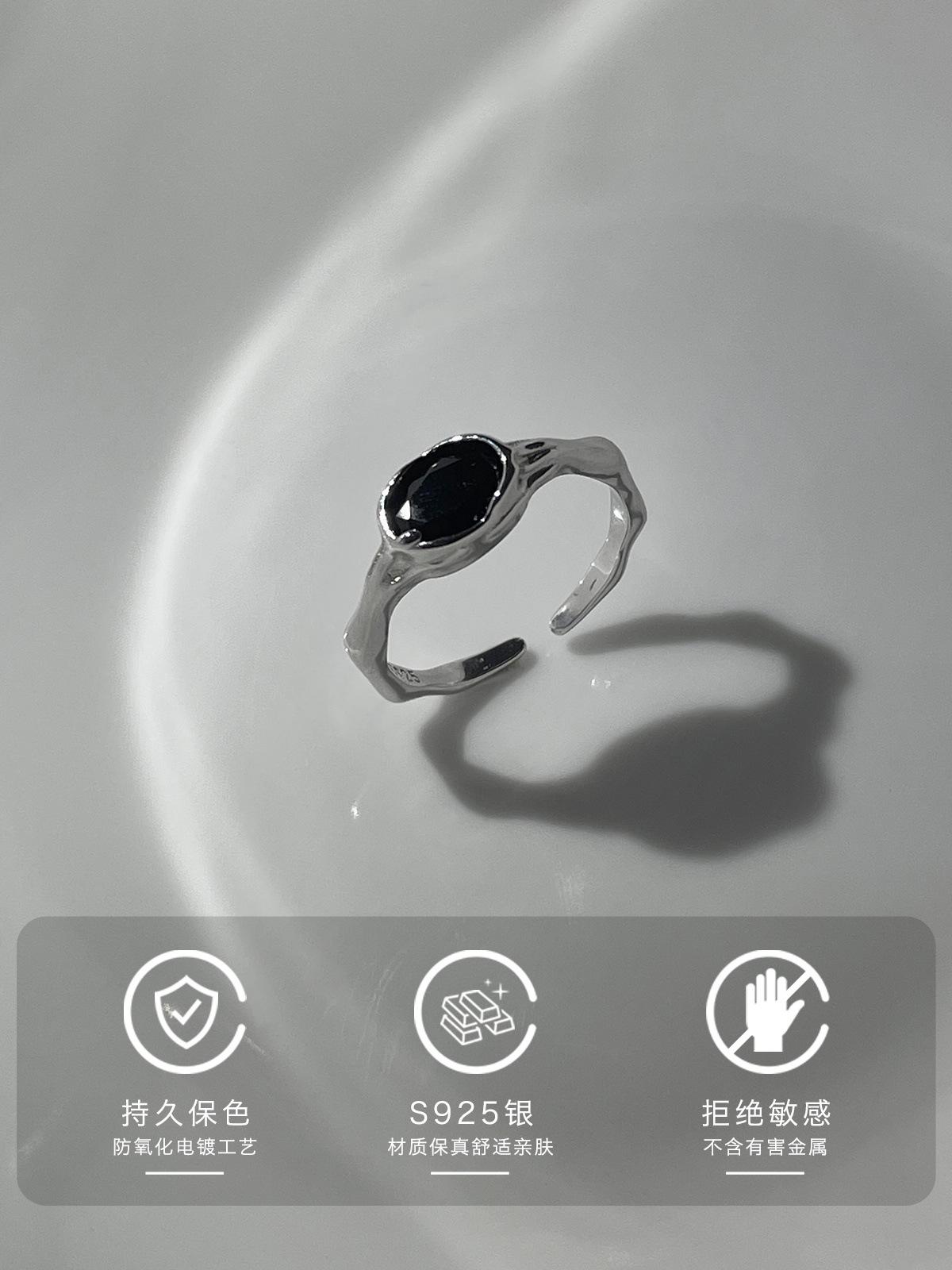 Кольцо неправильной формы из стерлингового серебра 925 пробы, простое и холодное кольцо на указательный палец с черным цирконием, легкая роскошь и изысканные ювелирные изделия высокого класса. Opening adjustable
