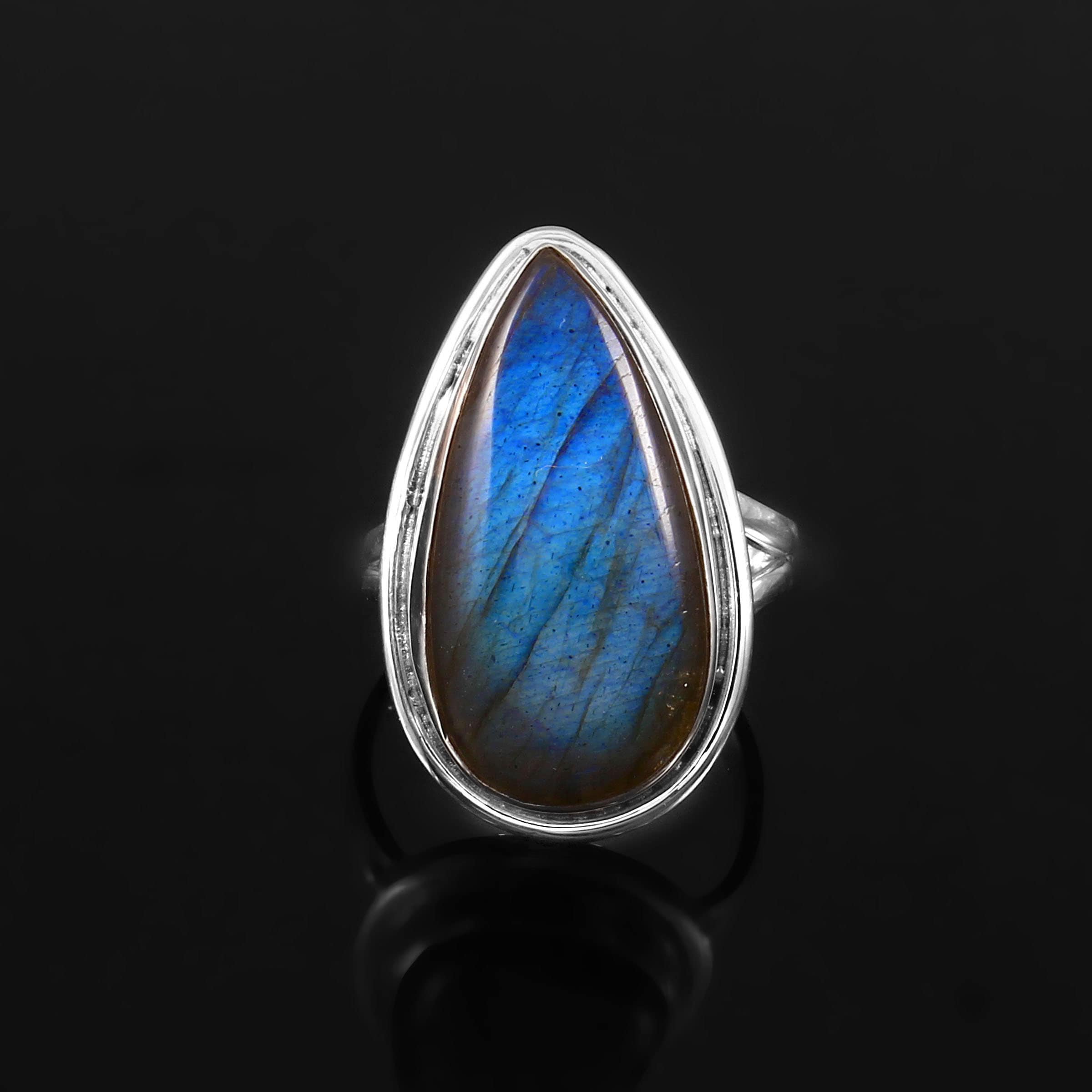 Кольцо ручной работы из цельного серебра 925 пробы с драгоценным камнем лабрадоритом, эффектное женское кольцо, подарок для нее. синий
