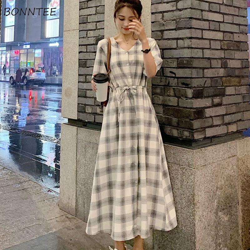 Dress Women Retro Plaid Summer Temperament Female Maxi Casual Lace Up Skinny Tunic V-neck High Waist Trendy Streetwear Harajuku, As shown