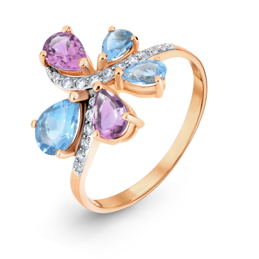 Кольцо из красного золота 585 пробы с топазом, аметистом и бесцветными фианитами (арт. Т147017056). Размер 16.