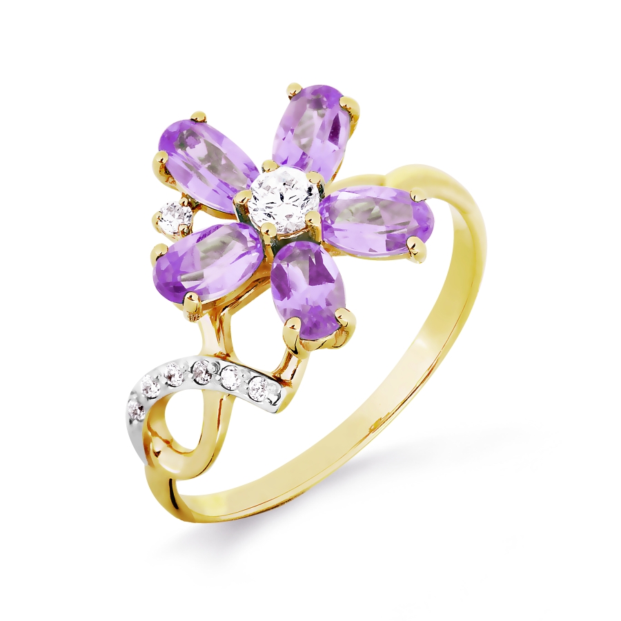Кольцо из желтого золота 585 пробы с аметистом и бесцветными фианитами (арт. Т993016480). Размер 16.