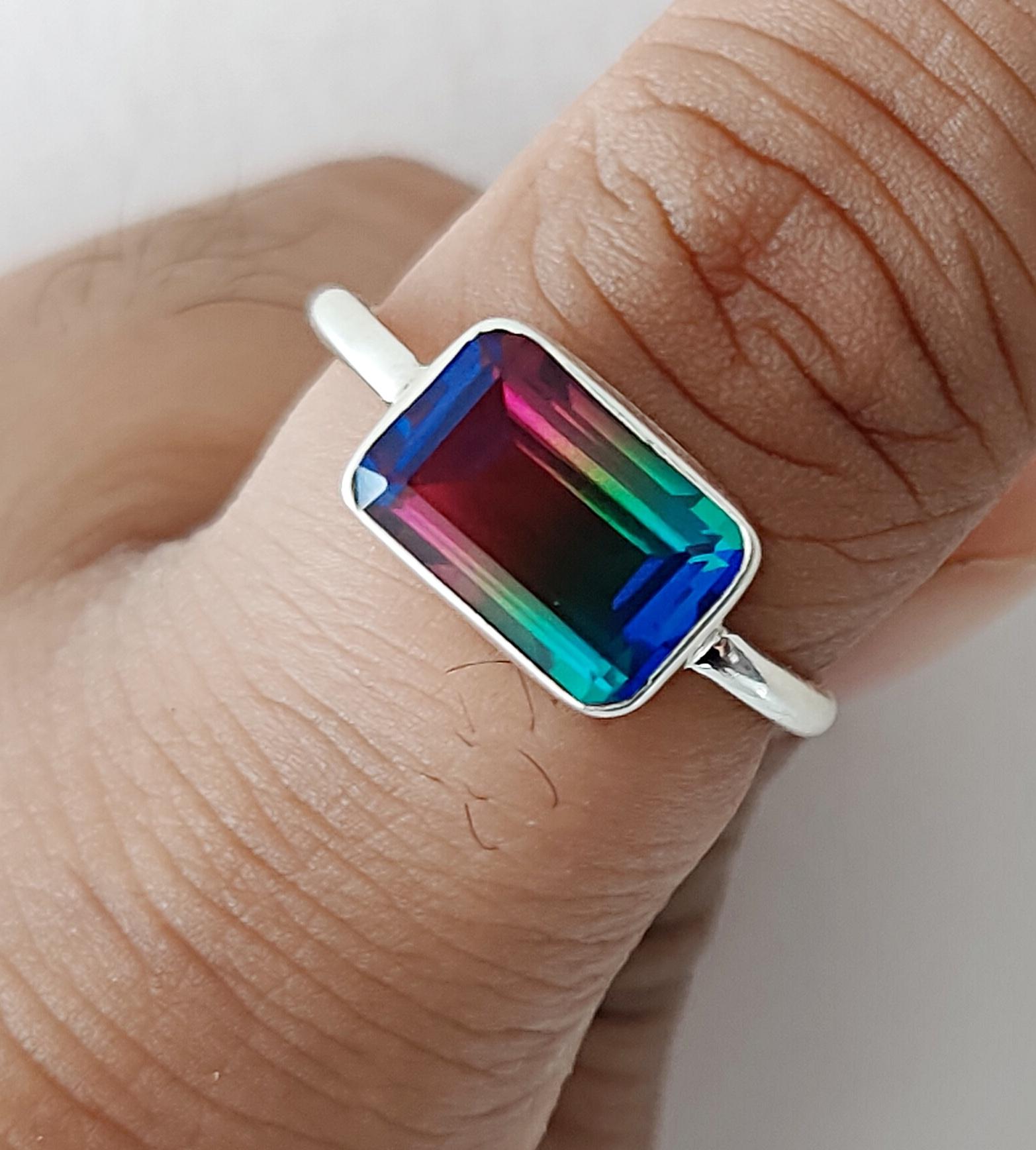 Кольцо с арбузным турмалином, серебро 925 пробы, эффектное кольцо, кольцо с турмалином и кварцем, форма изумрудной огранки, подарок для нее, кольцо с камнем 12