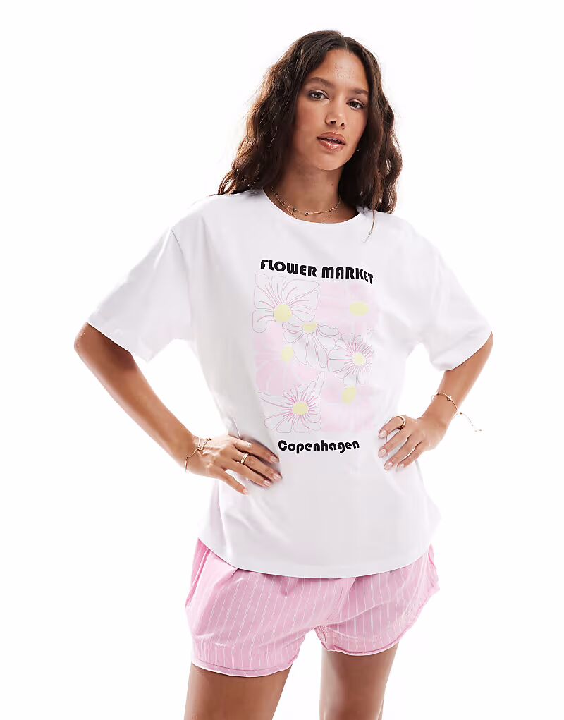 Футболка Pieces oversize с изображением цветочного рынка Копенгагена белого цвета