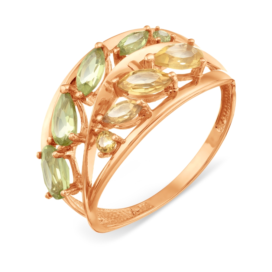 Кольцо из красного золота 585 пробы с хризолитом и цитрином (арт. Т101018280-04). Размер 17.