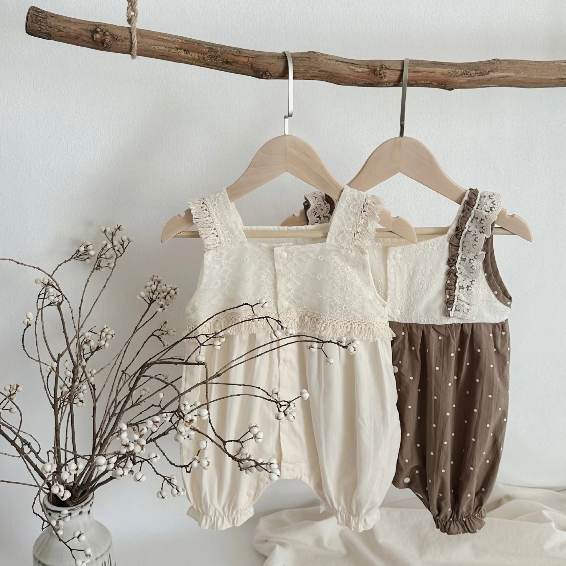 Комбинезоны детские летние без рукавов с цветочным краем и квадратным воротником