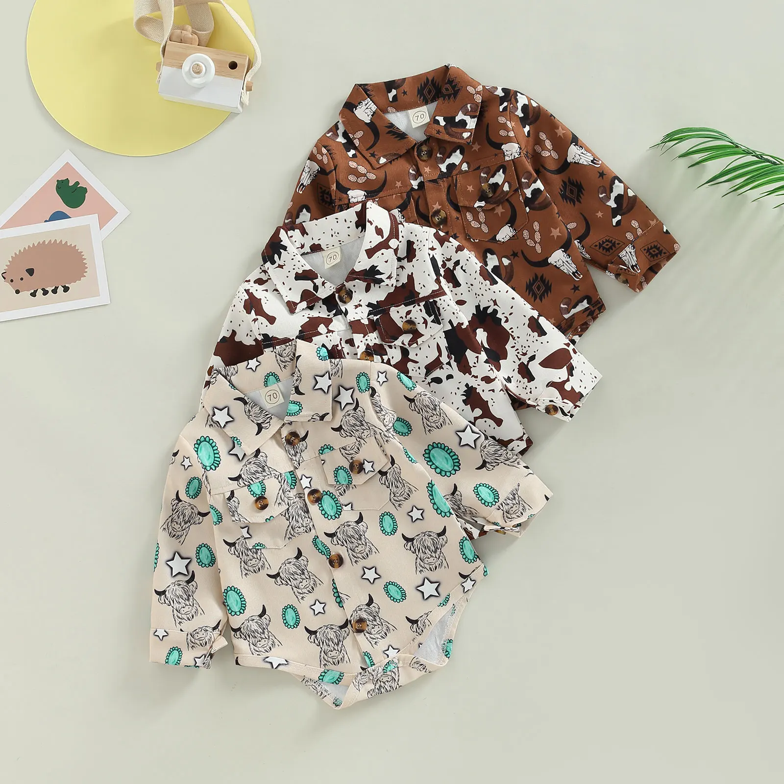Комбинезон для маленьких девочек с длинным рукавом и отложным воротником, Осеннее боди с коровьим принтом и пуговицами для повседневного н...
