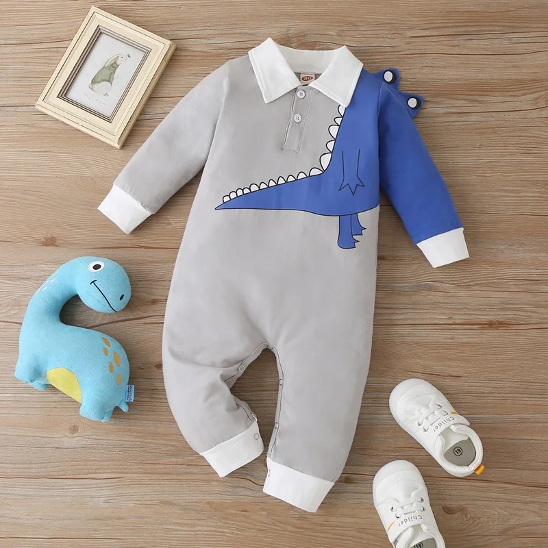Комбинезон для мальчиков 3-18 месяцев, хлопок, длинный рукав, отложной воротник, мультяшное животное, динозавр