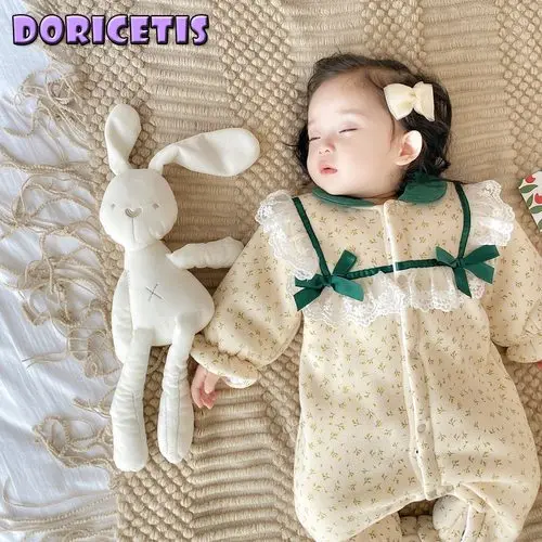 Комбинезон для новорожденных, милый комбинезон с цветочным узором, бантом и кружевом, комбинезон с длинным рукавом, детский зимний утепленн...
