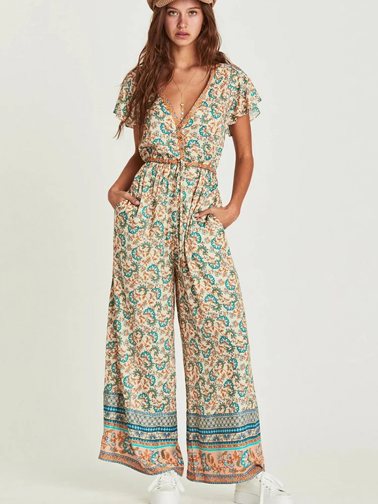 Комбинезон женский длинный с широкими штанинами и V-образным вырезом