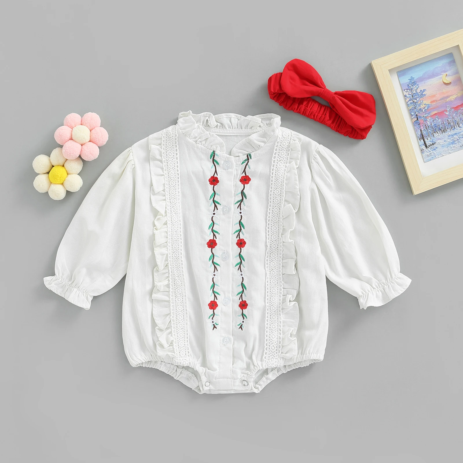 Комбинезон с цветочной вышивкой для маленьких девочек, комбинезон с длинными рукавами и рюшами, с круглым вырезом, на пуговицах + повязка на ...