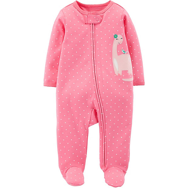 Комбинезон имеет молнию по всей длине, а шея и подбородок будут защищены дополнительной планкой на кнопке, которая также предотвратит расстёгивание. На горловине мягкий кант, который не натирает. Выполнен в розовом цвете и декорирован мелким горошком и принтом в виде динозавра.