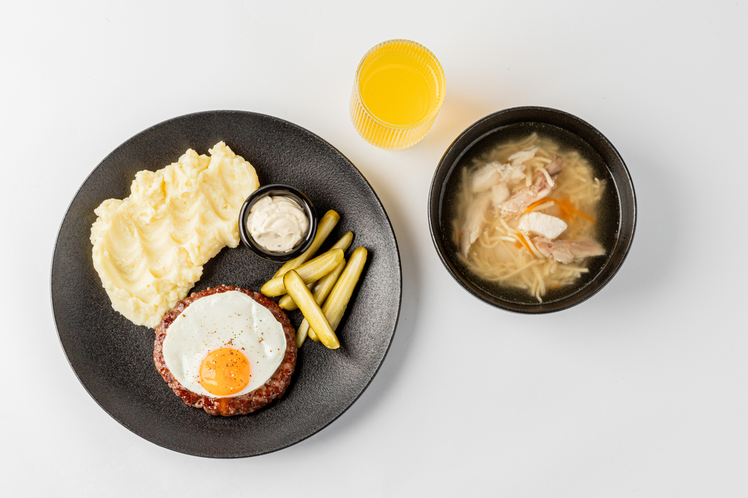 Комбо баланс: Бифштекс говяжий с яйцом и картофельным пюре Дк + Суп куриная лапша + лимонад